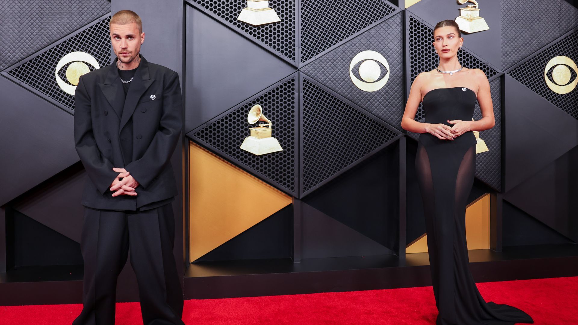 Para la ocasión, Hailey apostó por un vestido negro de Alaïa por Pieter Mulier e iba a juego con su marido, que eligió un total look del mismo color. La pareja aprovechó su posado en la alfombra roja para mostrar su oposición, con el pin que lucían en su pecho, a las políticas migratorias del presidente Trump. También lo hizo Bad Bunny en su discurso como ganador a Mejor Álbum de Música Urbana, cuando el puertorriqueño pidió "fuera ICE", el Servicio de Inmigración y Control de Aduanas de EE. UU.