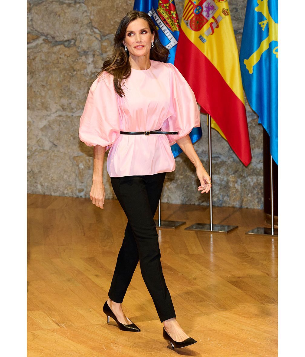 El concierto previo a los premios Princesa de Asturias coincidió con el día del cáncer de mama y la reina, oportunamente, eligió una blusa de mangas abullonadas de color rosa de María Barragán para componer un look que acompañó de un sencillo pantalón negro, salones de punta afilada y clutch de Magrit.