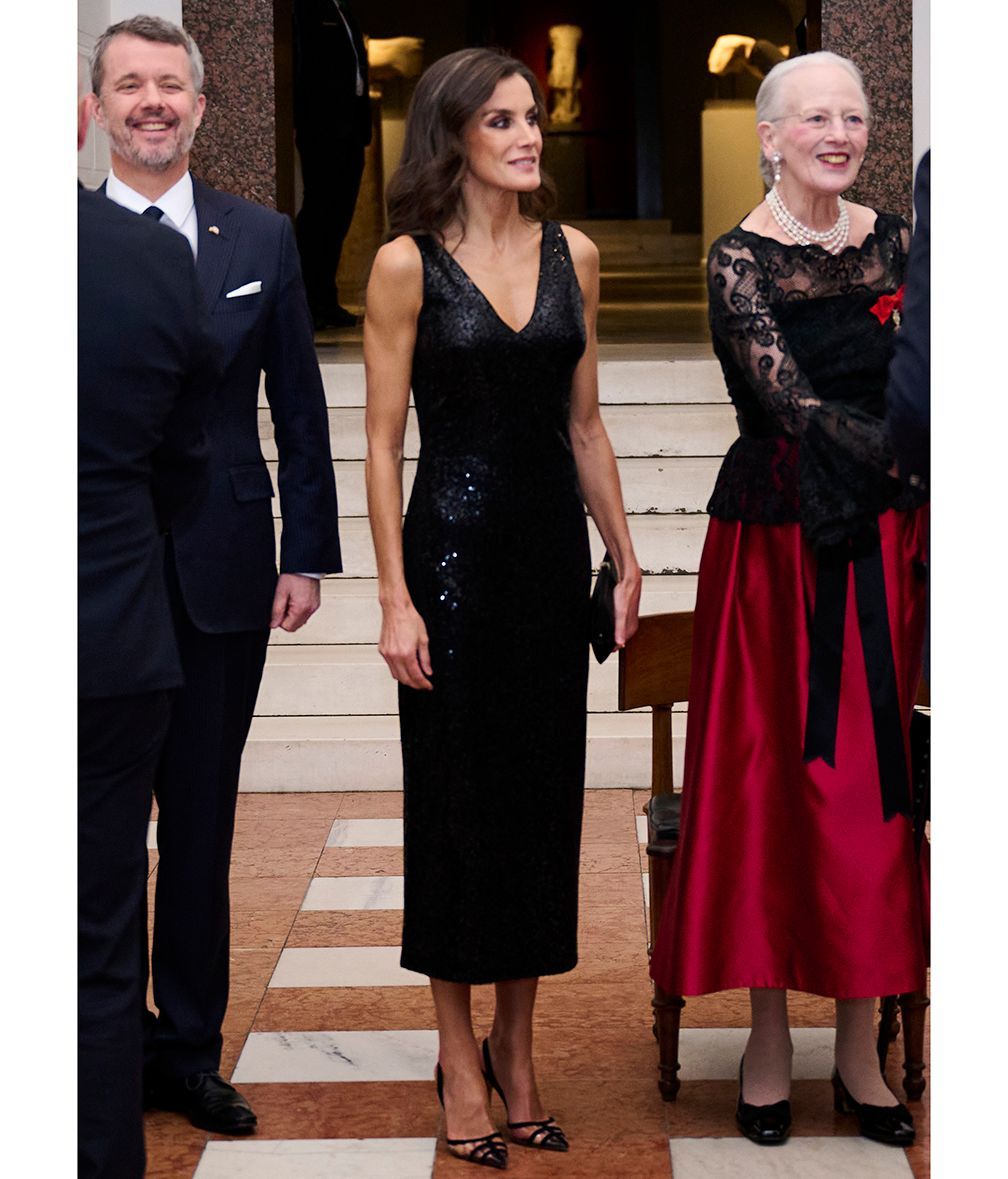 En la visita de los reyes a Dinamarca uno de los looks más aplaudidos de la reina fue el vestido de lentejuelas negro que eligió para su visita a la exposición "Joaquín Sorolla - Luz en movimiento". El modelo es de la firma danesa Rotate Birger Christensen, aunque la reina quiso hacer un guiño español con un abrigo de Mango. Completó el look con salones de Manolo Blahnik y los pendientes de chatones, una de las joyas de pasar del joyero real.