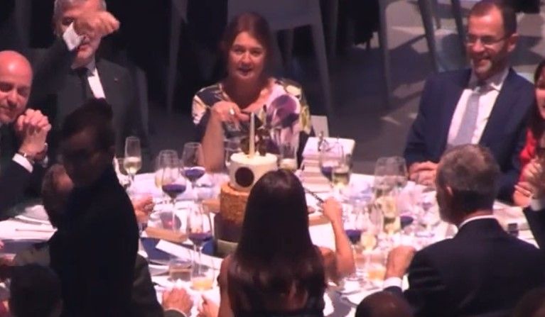 Como se puede ver en la siguiente sucesión de imágenes, los monarcas, rodeados de otros asistentes y autoridades, estaban sentados durante la cena, que consistió en un menú de vichyssoise de pera con tartar de gamba roja, lubina con espinacas a la catalana y pastel de aniversario en tres capas. En un momento dado, se puede apreciar cómo Letizia, después de charlar con el resto de comensales, coge con su mano un cuchillo para disponerse a cortar una tarta presente en el centro de la mesa, volcándose ligeramente sobre la mesa, levantándose incluso la silla en la que está sentada. Cuando su marido aprecia el movimiento, decide hacerle un gesto para evitar que efectivamente corta el pastel, estirando su brazo izquierdo para dar un ligero golpe a la reina en su extremidad, como forma de atención, riéndose luego y abriendo los brazos, en señal de sorpresa.